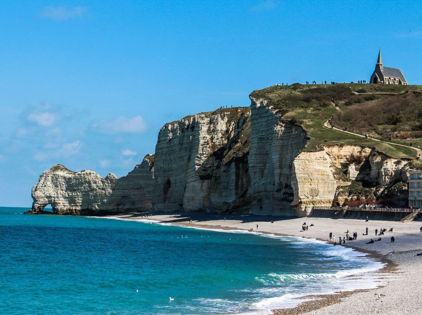 With its iconic cliffsides and stunning vistas, Étretat beach is considered one of Normandy’s most breathtaking spots. Flanked by the Amont and Aval cliffs that tower over 300 feet high, this pebble beach provides a dramatic and picturesque setting along the Alabaster Coast. The white chalk cliffs have been naturally carved into impressive arches and formations over time by the sea, creating sights like the Porte d’Aval arch and the Aiguille rock needle.