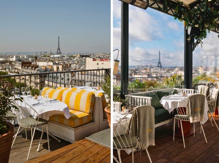 Offering a completely different perspective to restaurants with Eiffel Tower view, Perruche is located on the rooftop of the iconic Printemps Haussmann. Boasting a 360-degree of Paris, here it is less about being directly beside the Eiffel Tower but more about the wider Paris skyline.