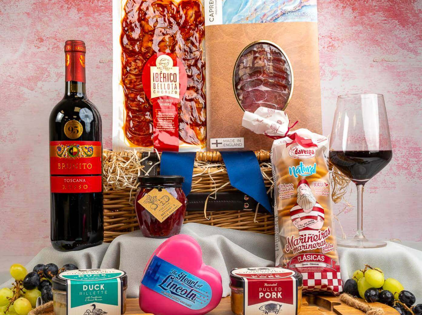 Complimenting these distinguished cheeses are the hand-selected accompaniments that elevate any cheese board. Together, they create a distinguished charcuterie and cheese experience to delight the most sophisticated palates. All comes lovingly packed in a luxury hamper basket.