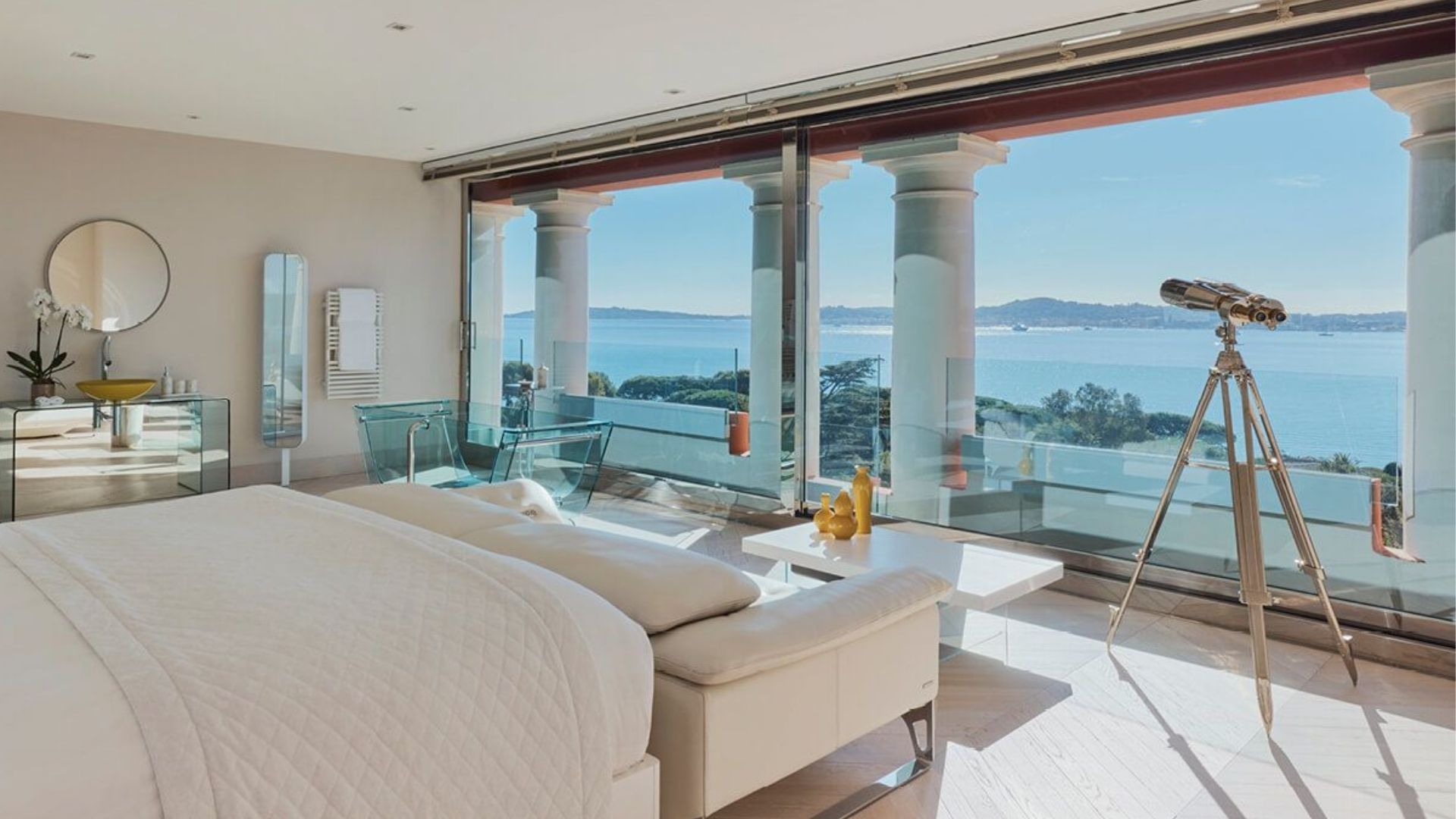 The mood is pure Côte d’Azur: shuttered façades, wide lawns, palms swaying beside the water and a shimmering 25-metre mosaic-tiled pool that feels made for long, lazy afternoons. A private pontoon and beach club only add to the sense that this is your own little stretch of coastline, wrapped in old-world glamour and modern ease.