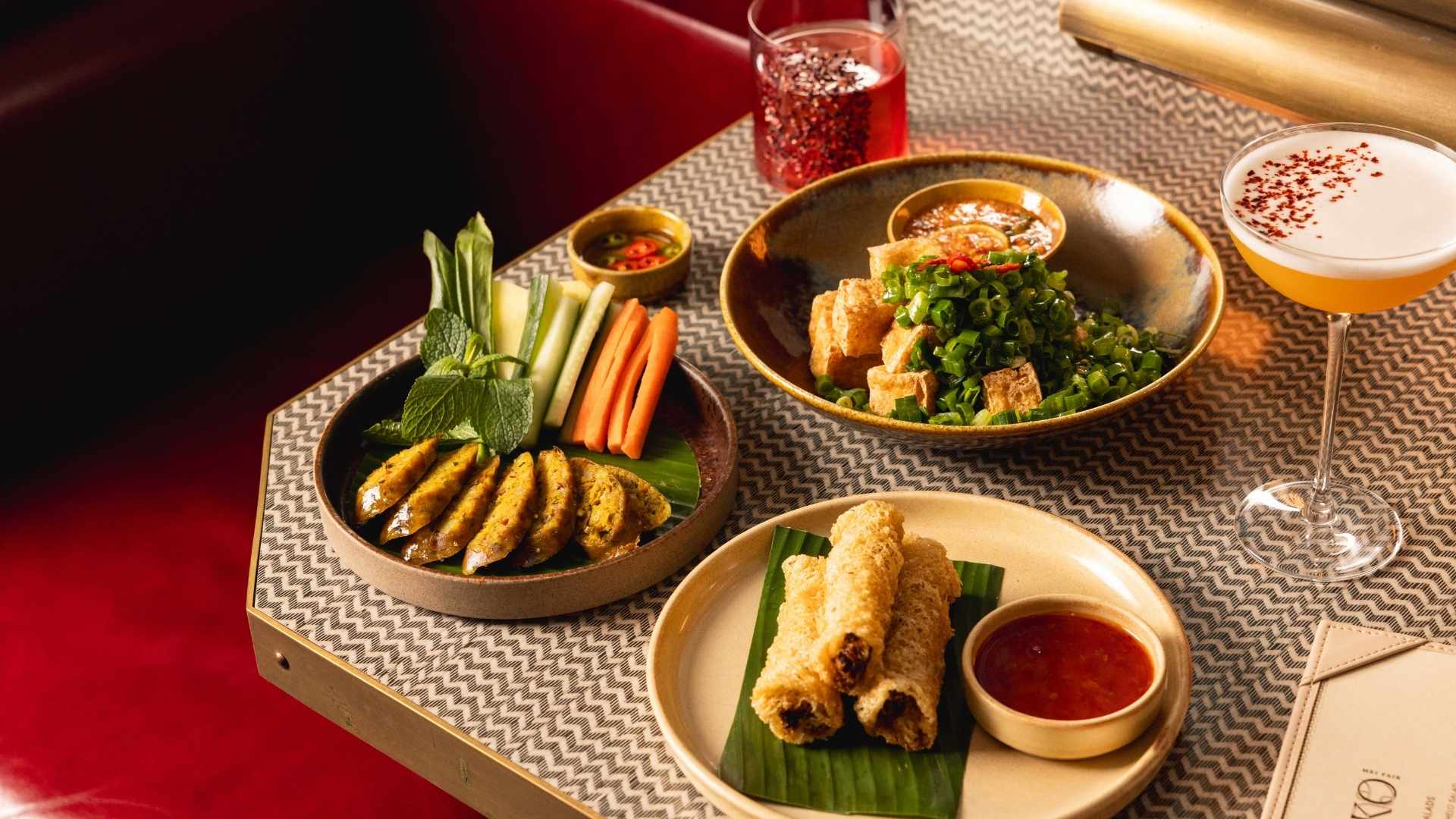 The room itself is maximalist in the best possible way. Teal and timber panelling, red leather booths, warm brass accents and gold leaf lotus details create a layered, salon-style setting that feels rooted in Thailand without ever feeling themed. And discreetly set behind elegant folding timber screens is the Peacock Room, an intimate eight-seat private dining space adorned with hand-painted chinoiserie wallpaper, shared between MIKO and MiMi Mei Fair, where the Thai and Chinese concepts of the townhouse quietly meet.