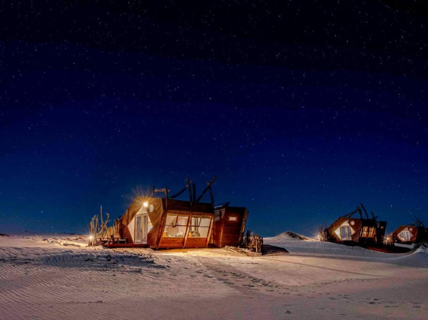 As one of the few lodges in Namibia’s Skeleton Coast National Park, Shipwreck Lodge offers a unique experience among the best hotels in Namibia for stargazing. The uniquely designed cabins in the shape of a shipwreck come with big windows and private terraces that open up to vast views of the sand dunes and the Atlantic Ocean, ideal for peaceful nights under the sky.